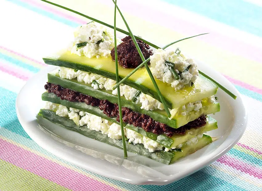 Confectionnez votre millefeuille : commencez par poser une tranche de concombre, tartinez-la de fromage, posez dessus une autre tranche de concombre et tartinez-la d’olives mixées. Alternez plusieurs couches en terminant par une tranche de concombre.