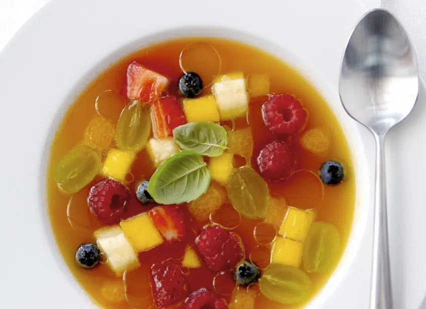 Dans un récipient, mélangez les fraises, la banane, la mangue, les abricots, les kiwis, les raisins, les myrtilles et les framboises. Arrosez les fruits de sirop.