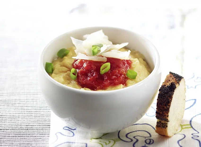 Faites cuire 10 min. sur feu doux, tout en remuant, la tomate, l’ail dégermé et pressé, l’huile, le sel, le poivre. Réservez au chaud.