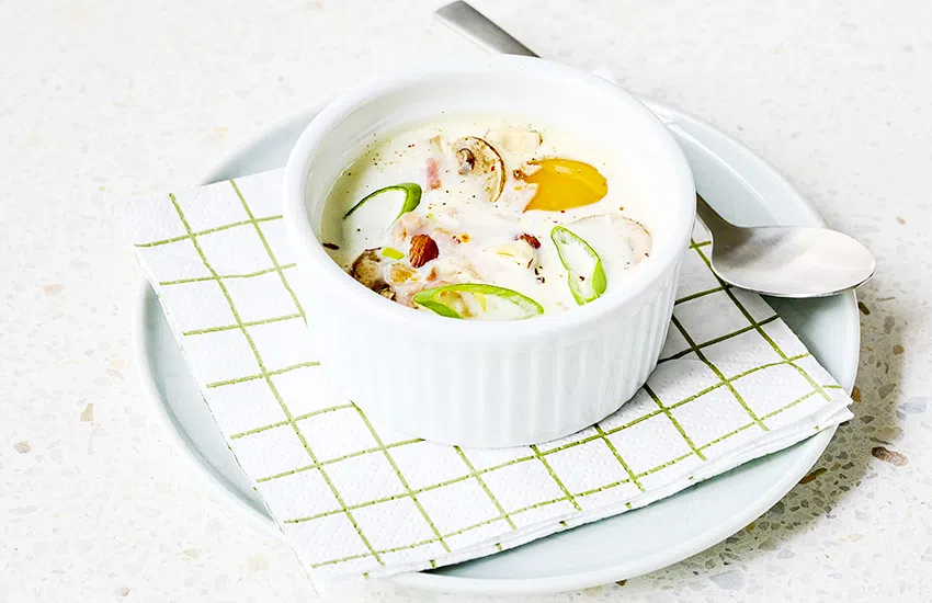 Dans un ramequin, mettre 1 œuf, 5 cl de crème, 1 champignon de paris coupé en fines tranches et l’équivalent d’une tranche de bacon tranchée et grillée.