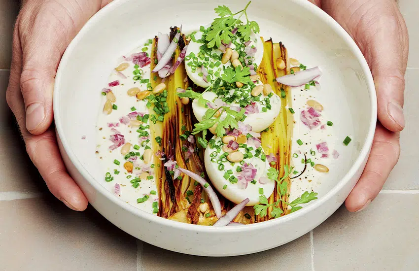 Couper les blancs de poireaux en 2, les badigeonner avec l’huile de pépins de raisin à l’aide d’un pinceau et les cuire pendant 20 min sur une plaque dans un four préchauffé à 180°.