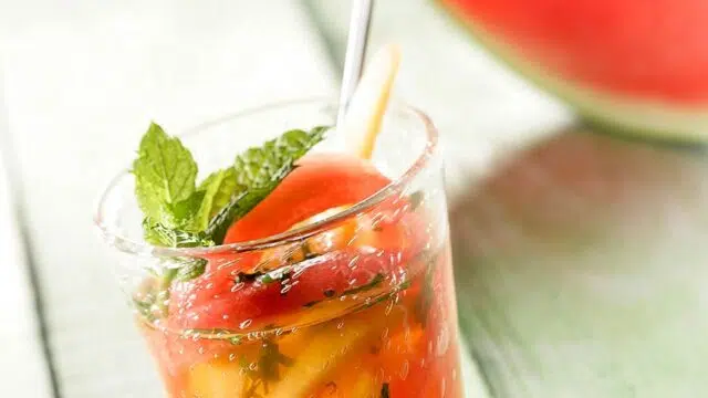 Prendre la pastèque, l’ouvrir par le chapeau et la vider de sa chair.Mixer la chair et réserver.