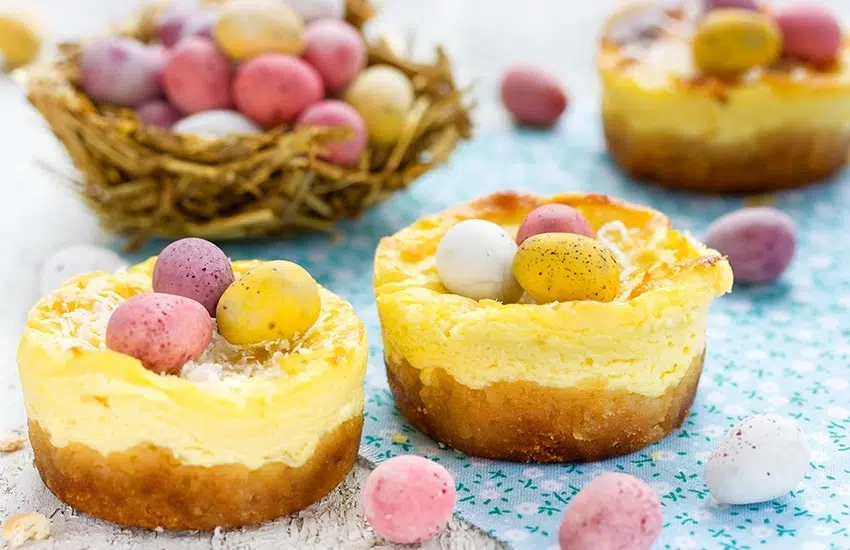 Au moment de servir, démoulez les cheesecakes et garnissez ces petits nids d’œufs en sucre