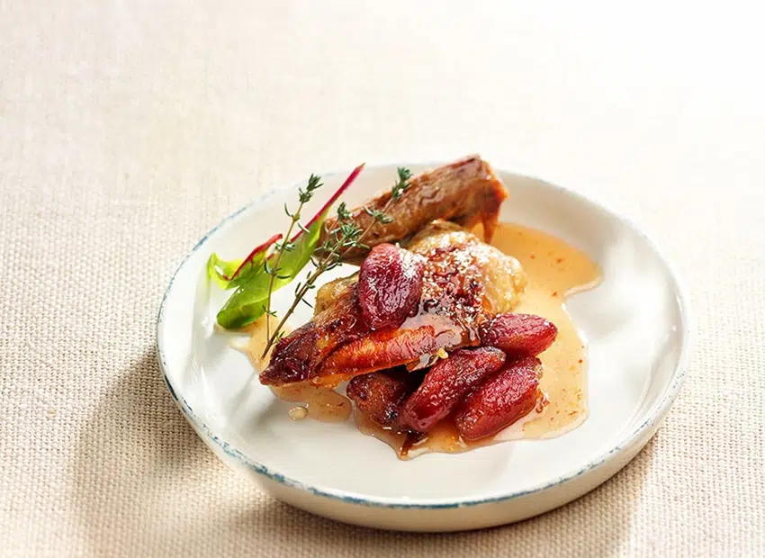 Servez le pigeon avec la purée de pois de chiche et les dattes confites.
