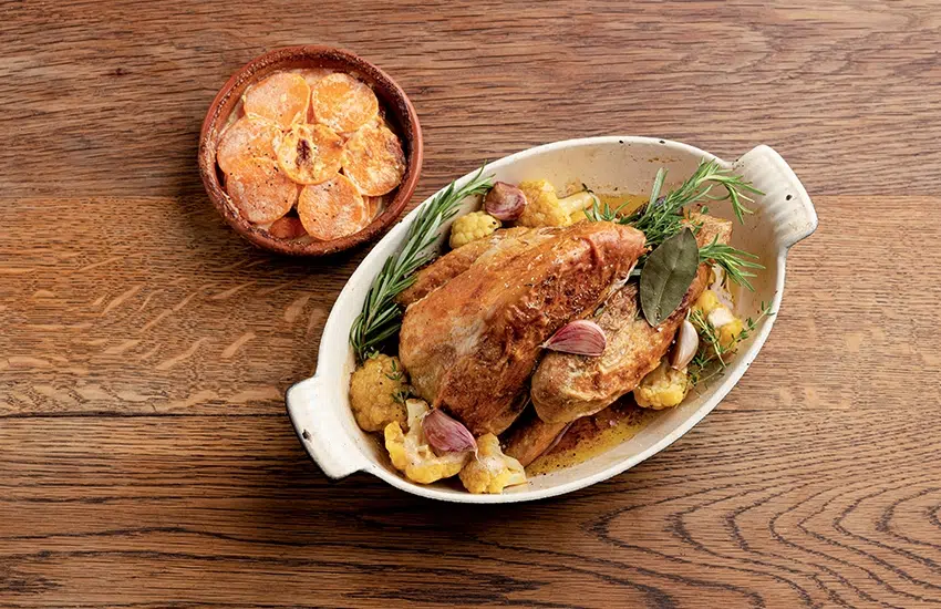 Pintade, gratin de courge & chou-fleur beurre noisette