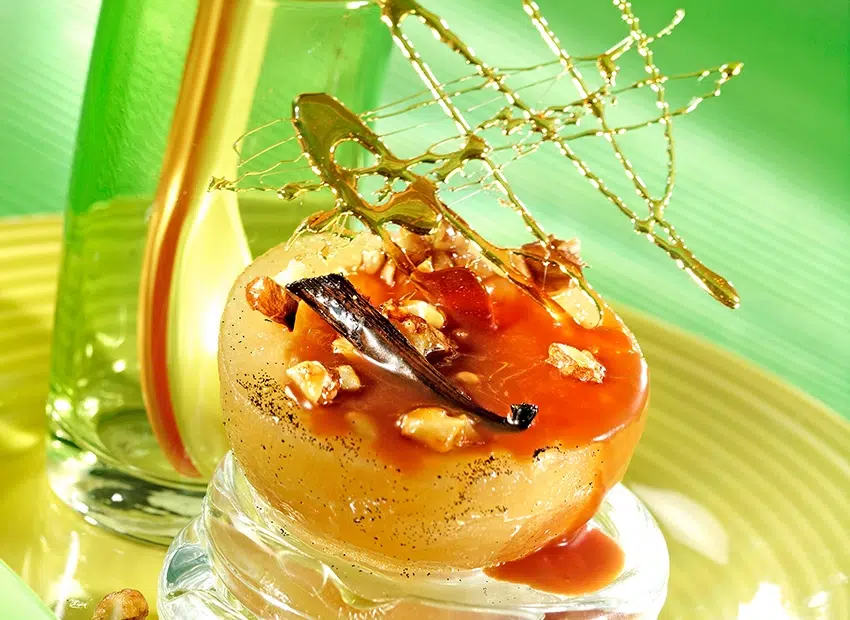 Dans des assiettes à dessert, dressez les demi-pommes et remplissez le cœur avec la sauce tiède. Saupoudrez avec les amandes grillées et décorez avec des tronçons de gousse de vanille.