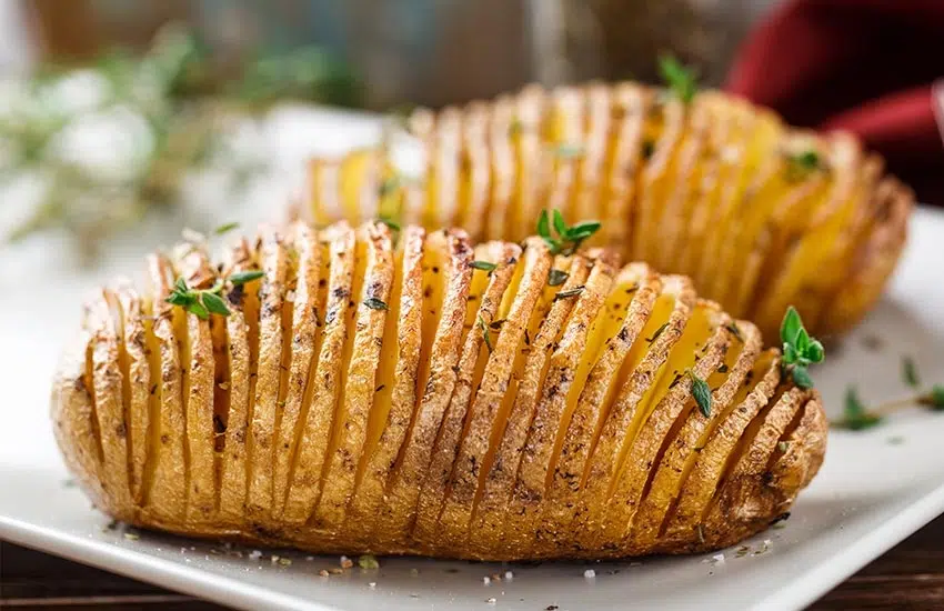 Conseil : pour réussir la découpe, posez votre pomme de terre entre 2 cuillères en bois (ou 2 baguettes chinoises), cela permettra à votre couteau d’être arrêté, de ne pas couper trop bas et de laisser les tranches solidarisées entre elles.