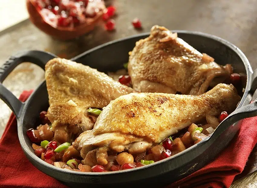 Servez le poulet avec son mélange, parsemé de graines de grenade et d’oignon frais.