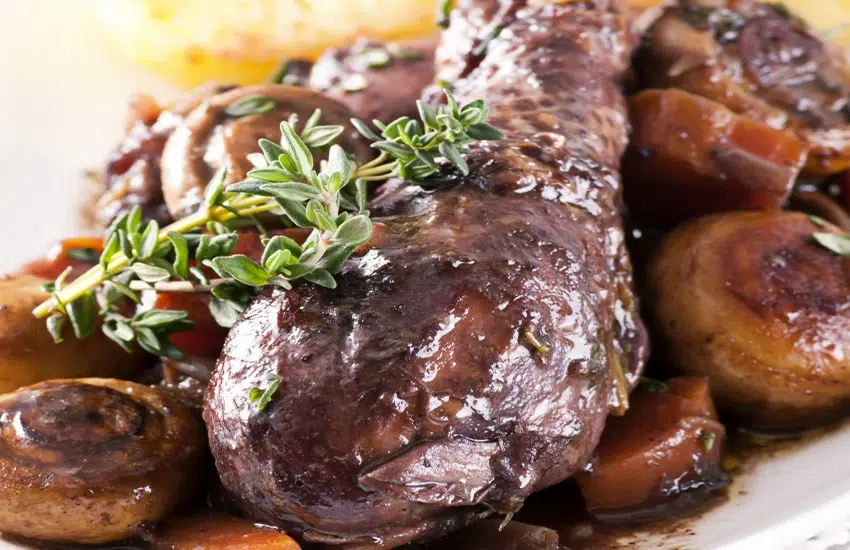 Ajoutez le reste du vin, les carottes en rondelles, le bouquet garni, ail, sel, poivre et herbes de Provence.