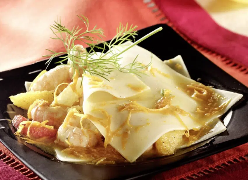 7. Disposez dans des assiettes creuses un carré de pâte, garnissez avec les queues des langoustines, les agrumes, l’aneth haché et recouvrez avec un deuxième carré de pâte. Au moment de servir, arrosez avec le jus réduit et décorez d’un brin d’aneth.