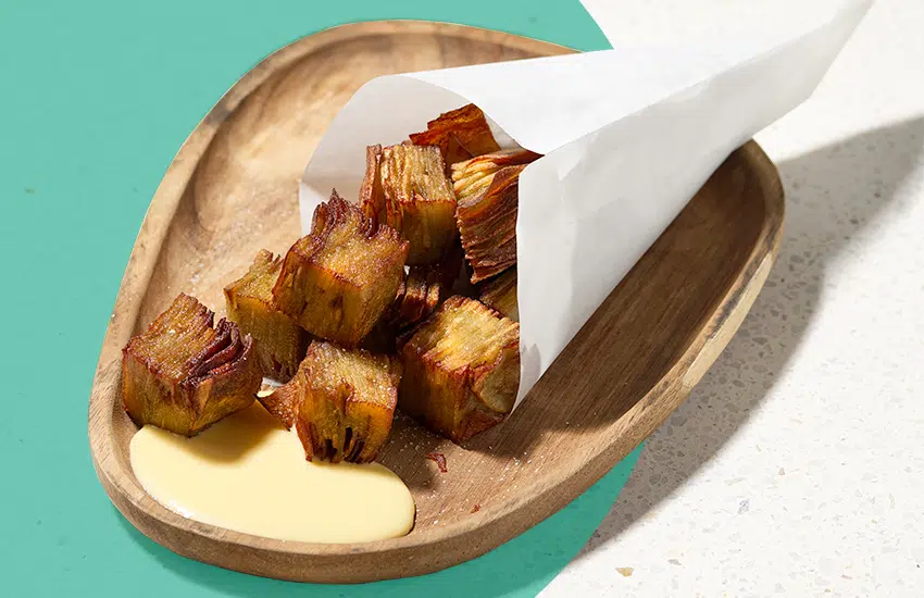 3. Découper des cubes de 2cm sur 2cm et les frire à l’envoi dans une friteuse préchauffé à 170° pendant 5 min.