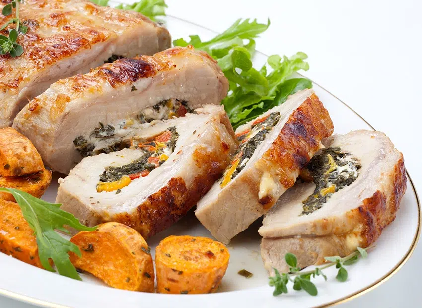 Rôti de porc farci aux épinards, féta et poivrons