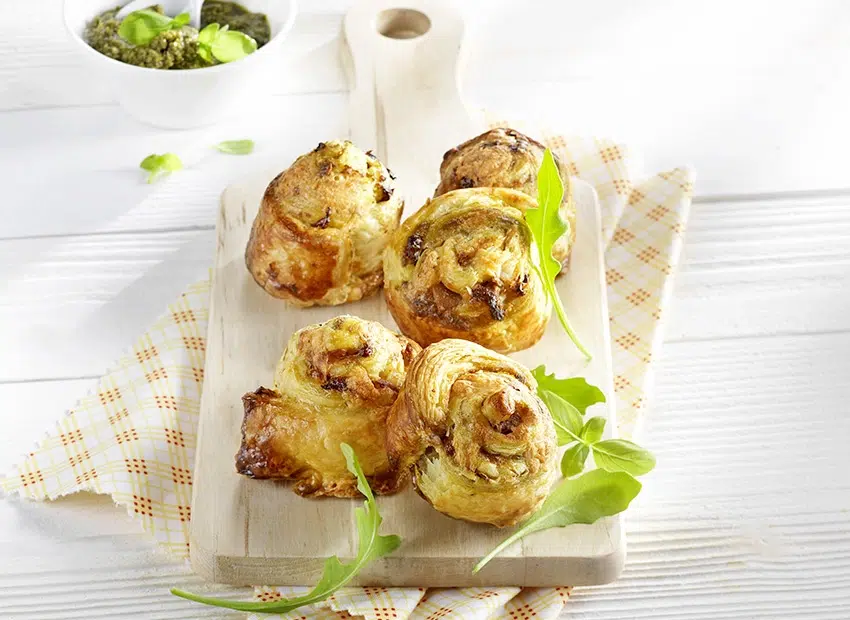 Roulez en escargots, badigeonnez de jaune d’œuf battu et fixez bien les bords. Enfournez 20 min.