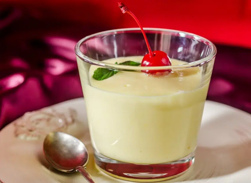Retirez du feu, laissez refroidir et servez. Décorez d’une cerise confite et d’une feuille de menthe