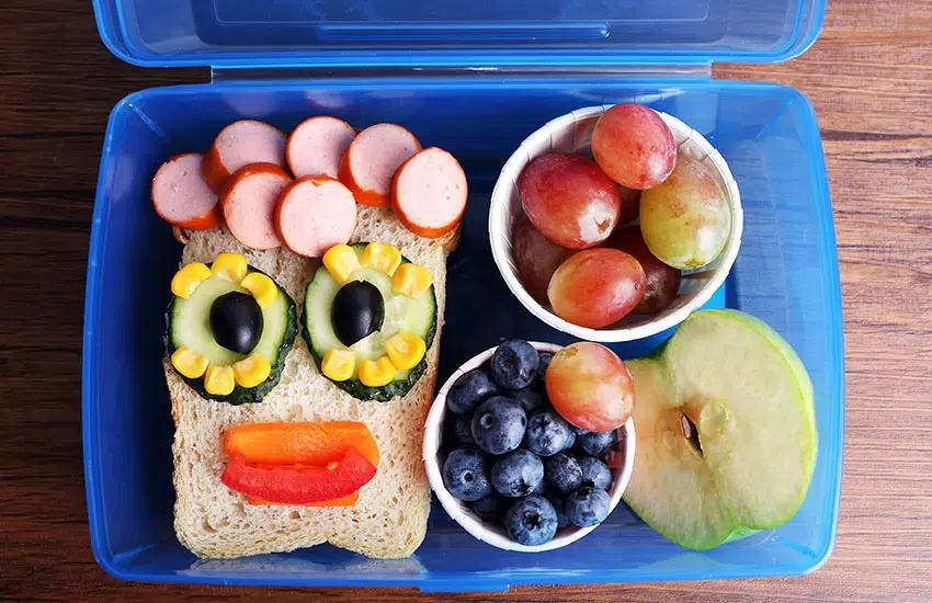 Sur le sandwiche fermé, créez un bonhomme : des rondelles de saucisse pour les cheveux, pour les yeux, les rondelles de concombre, le maïs et l’olive noire coupée en deux et pour le sourire, de fines tranches de tomate. Maintenez le tout en place avec du film alimentaire.
