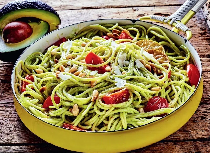 Dans le robot, mixez 4 càs de pignons, les avocats, les feuilles de basilic, l’ail, le jus de citron et l’huile d’olive jusqu’à obtention d’un pesto bien lisse