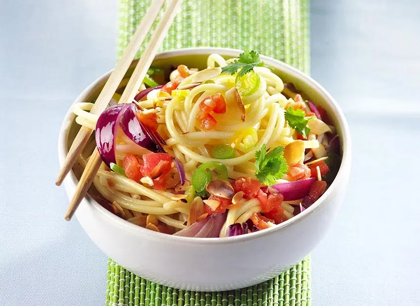Dans une grande casserole d’eau bouillante salée, faites cuire les pâtes. Egouttez-les et ajoutez-les dans la sauteuse ainsi que les amandes effilées.