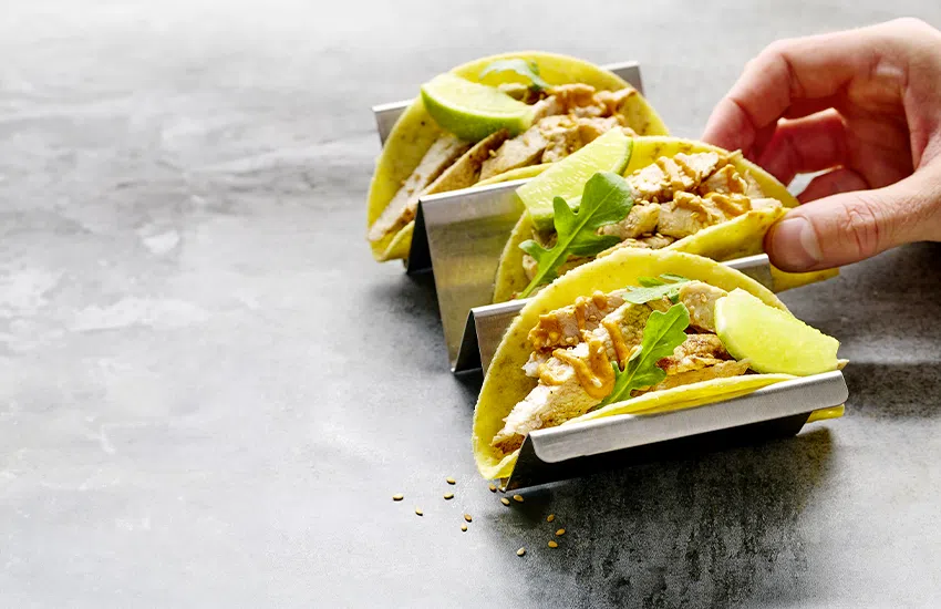 Tacos de poulet mariné aux épices douces, mayonnaise au sésame, crème de poivron et salade de roquette