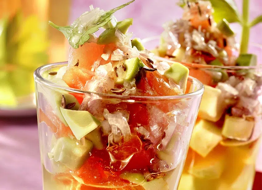 Mélangez les dés de tomates avec les dés d’avocat et arrosez avec la sauce. Décorez avec les feuilles de persil et servez bien frais.