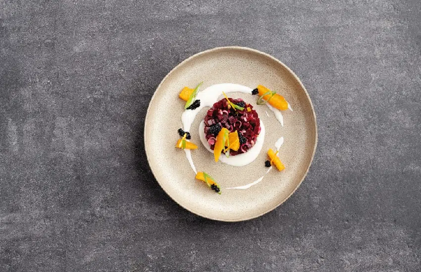 Mélanger la brunoise de betterave avec les suprêmes d’orange, ainsi que les jeunes oignons préalablement ciselés. Assaisonner de sel, de poivre et d’huile d’olive.