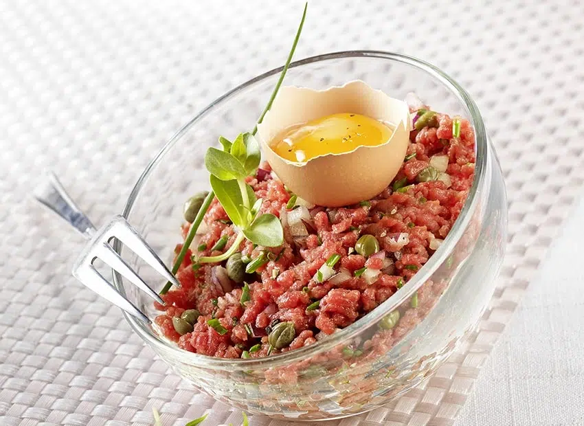 Déposez la viande dans des petits plats individuels et placez sur le dessus, un jaune d’œuf dans sa coquille.