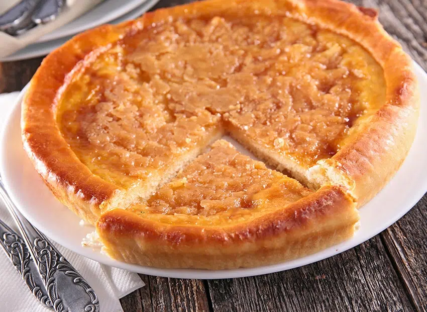Recouvrez la pâte d’une couche de cassonade puis mouillez avec le mélange œuf-crème battu. Finissez avec des noisettes de beurre.