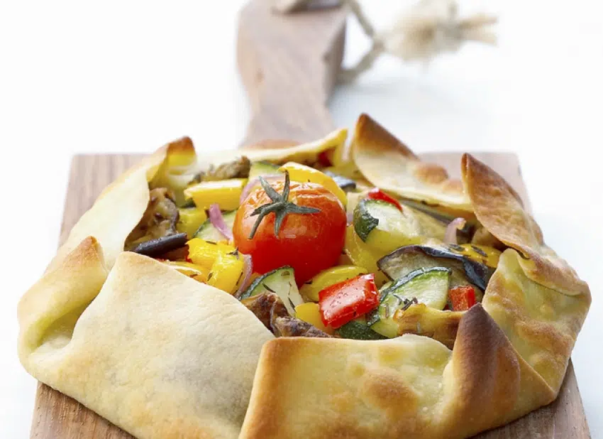 Déroulez la pâte à pizza. Aplatissez-la sur le plan de travail fariné jusqu’à ce que la pâte soit très fine (1 mm). A l’aide d’un pinceau, enduisez la pâte de pesto. Répartissez les légumes rôtis et les aubergines sur le fond de tarte jusqu’à 2 cm du bord. Repliez le bord vers l’intérieur. Badigeonnez avec le restant d’huile d’olive.