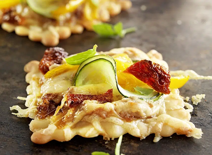 Garnissez-les de mozzarella, tomate et courgette, Saupoudrez de sel et de piment