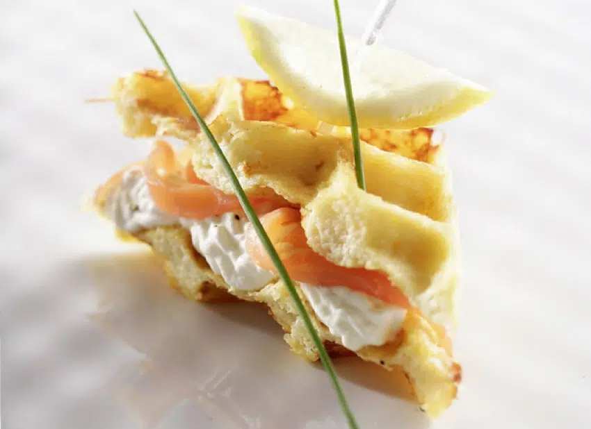 Coupez chaque gaufre en 2, garnissez une 1ère partie avec de la chantilly et un morceau de saumon puis fermez avec la seconde partie. Décorez de brins de ciboulette