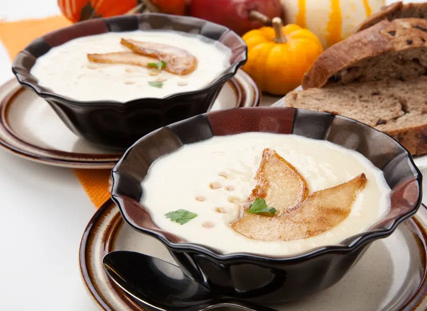 5. Servez ce potage avec de fines lamelles de poires rissolées au beurre.