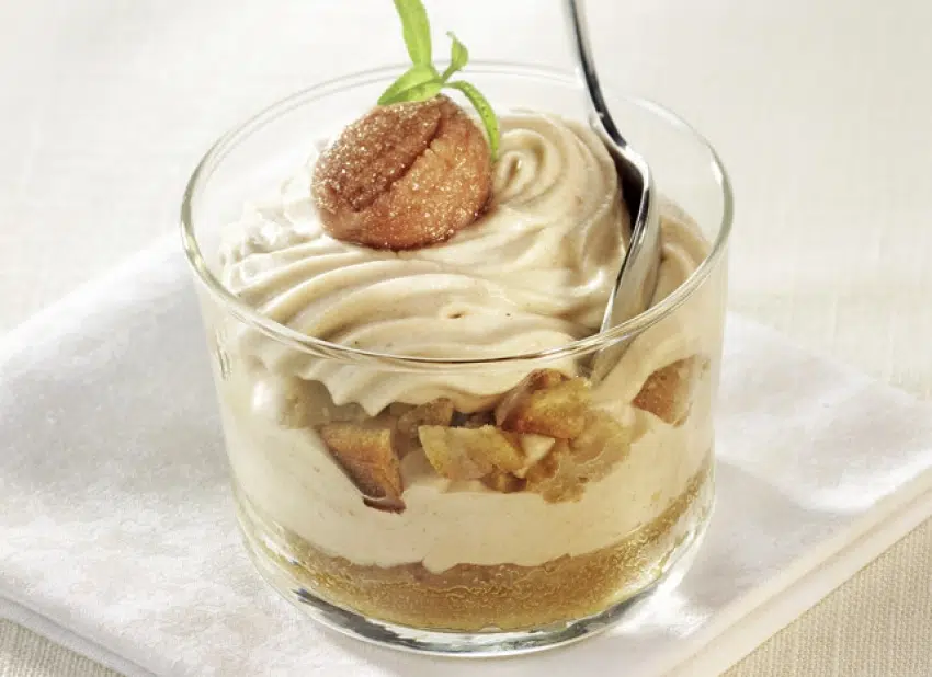 Décorez chaque verrine d’1 marron confit et d’1 feuille de menthe.