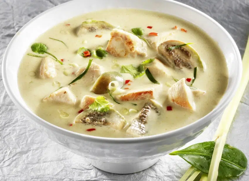 Portez à ébullition, dans une sauteuse, la pâte de curry et le lait de coco. Mélangez et laissez mijoter 5 minutes à feu doux.