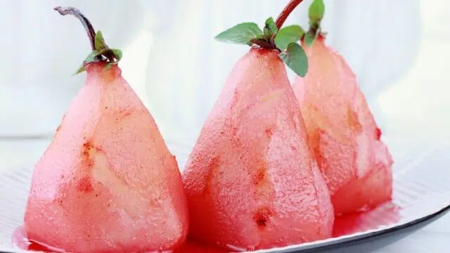 Poires pochées au Rosé et crème de cassis