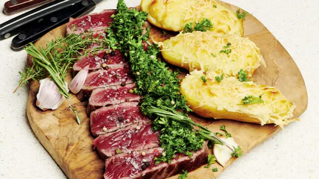 Entrecôte grillée accompagnée de sa pomme de terre macaire et chimichurri maison